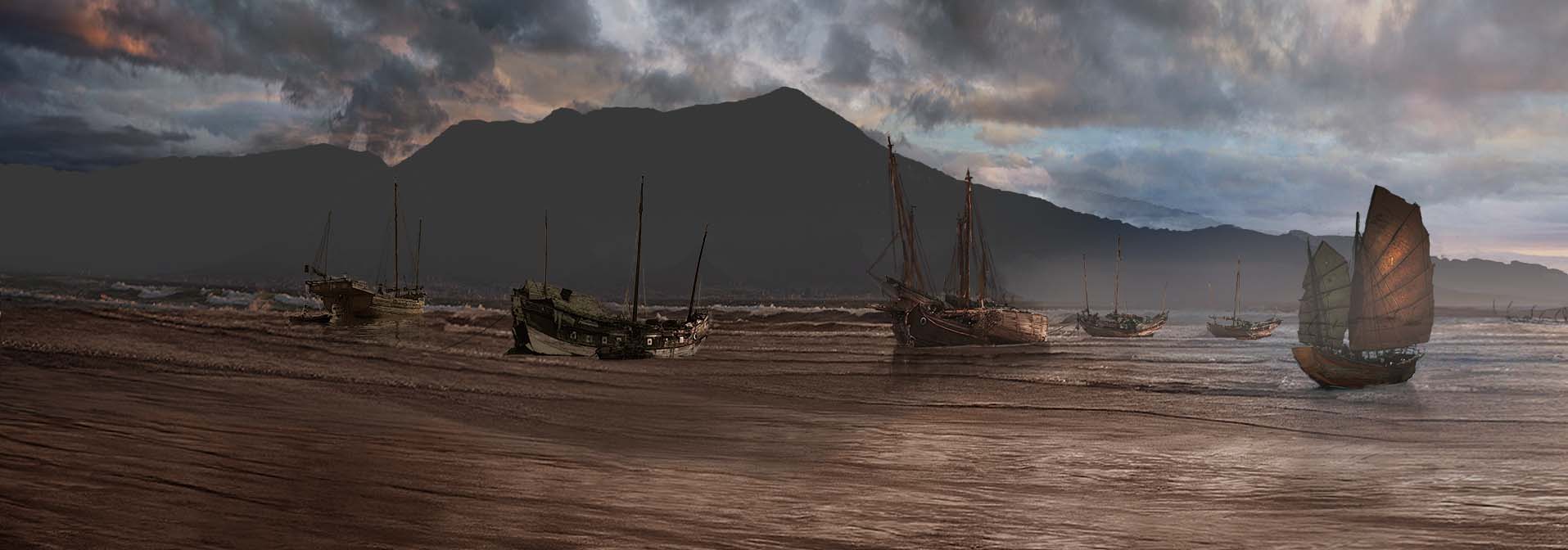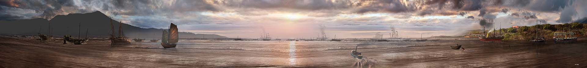 本圖以台灣八景之一的「淡水夕照」為場景設定的時間點,希望在漁人碼頭欣賞夕照的遊客能緬懷一百多年前沉浸在同樣美景下的淡水,曾經是世界關注的戰爭焦點。