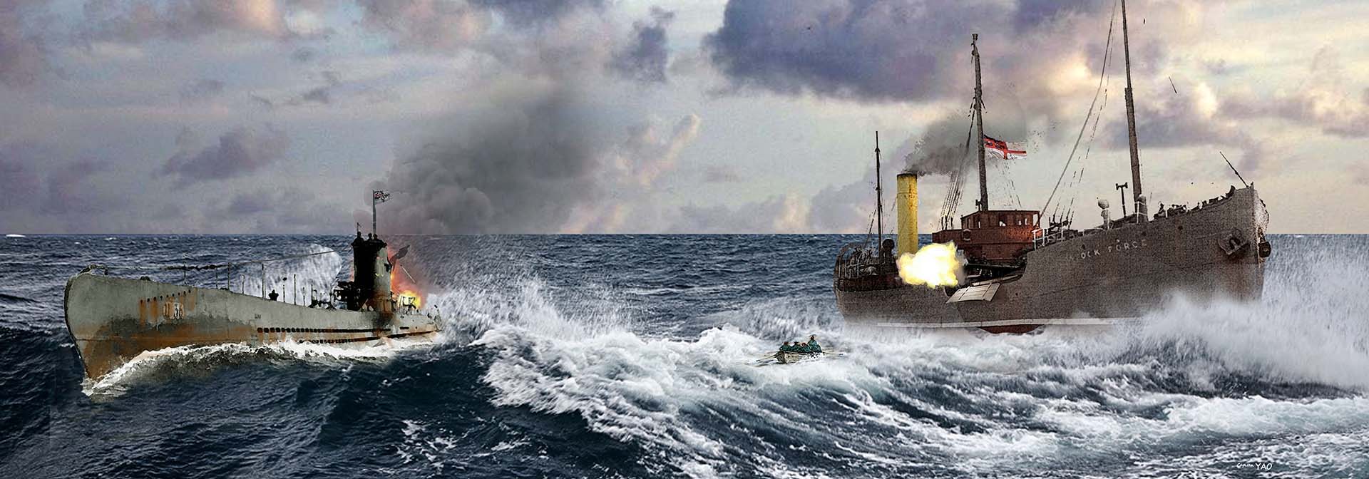 德國海軍實力不如皇家海軍,只能依靠潛水艇封鎖英倫三島,希望斷絕大英帝國來自海外殖民地的物資補給。德國人很老實,完全遵守交戰公約,潛艇攻擊前按規定要先浮出水面,發出信號要求對方停船,然後軍官帶領一小隊官兵划小艇登船檢查文件與貨艙,如果發現是運往英國的戰略物資才會予以擊沉,之後還要收容船員。