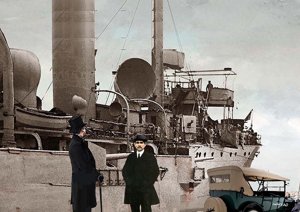 (圖1-10-3) 德芮肯爵士趕往碼頭勸阻孫文,雙方不歡而散。
