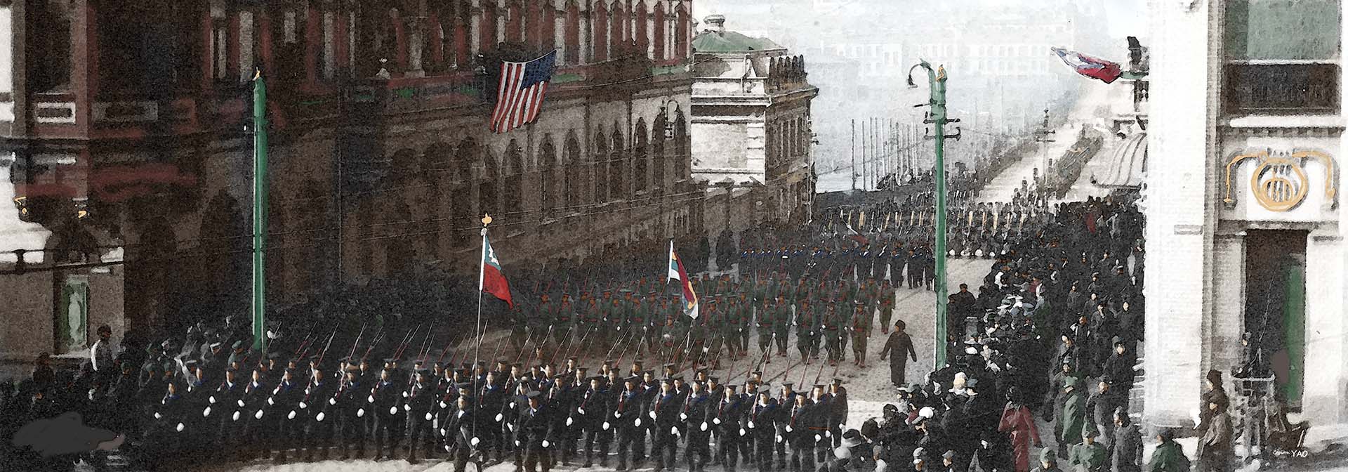 (圖1-10-6) 協約國佔領軍在海參崴大街上遊行,圖為中國海陸軍方隊。