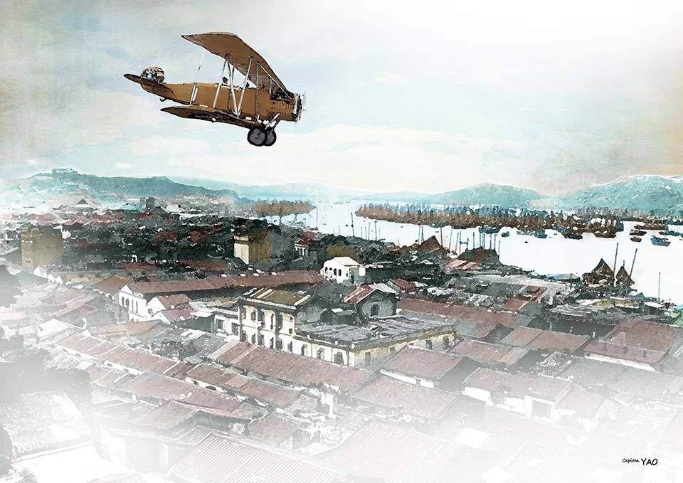 So I put on my leather hat and goggles and sat in the front seat of the plane, with the pilot in the back. We took off from the airport and arrived over Kuangchow. The humid and sweltering summer heat of South China instantly became cool and refreshing in the air. I leaned down and looked down at the buildings below, which seemed so small. Even the vast Pearl River looked like a ribbon. Many boats of all sizes were moored on the river, and a small Chinese gunboat was slowly sailing downstream. When the plane turned a certain angle, the sunlight shone brightly on the water, making it hard to open my eyes.