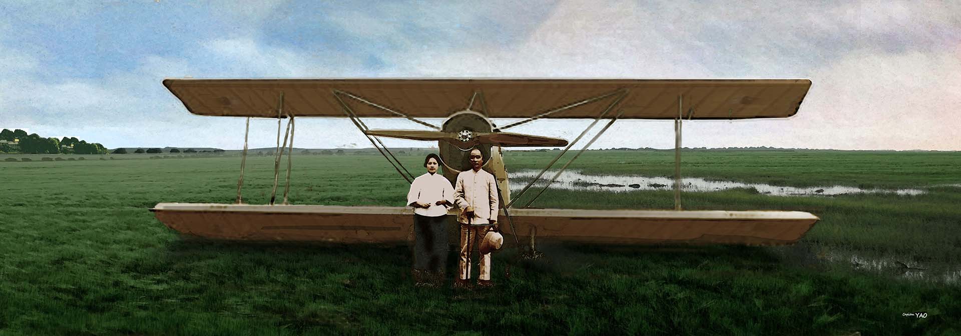 (Figure 1-12-2) A photo of Sun Yat-sen and Soong Ching-ling standing in front of the "Rosamond" airplane.