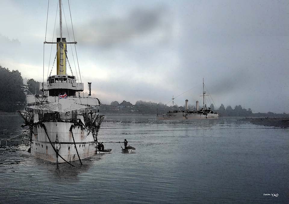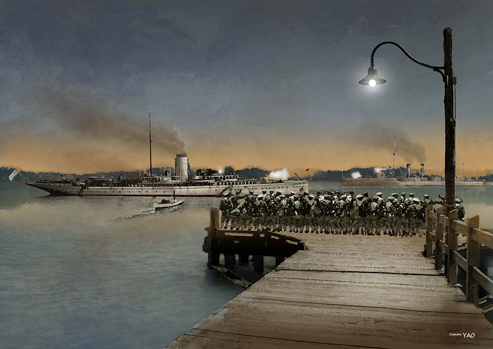 On June 29, Chiang Kai-shek arrived in Kuangchow and boarded the gunboat "Yungfeng". At that time, seven naval vessels supporting Sun Yat-sen were hiding in the waters of Baietan next to the British Consulate and were engaged in combat with Chen Jiongming's troops on land. Shells frequently flew over the city, causing panic among the citizens and threatening the property and lives of local Westerners. As a result, the British Consulate intervened and demanded that the ships leave Baietan. Sun Yat-sen and others had no choice but to take the British gunboat "HMS Moorhan" to Hong Kong on the afternoon of August 9 and transfer to a ship to go to Shanghai.