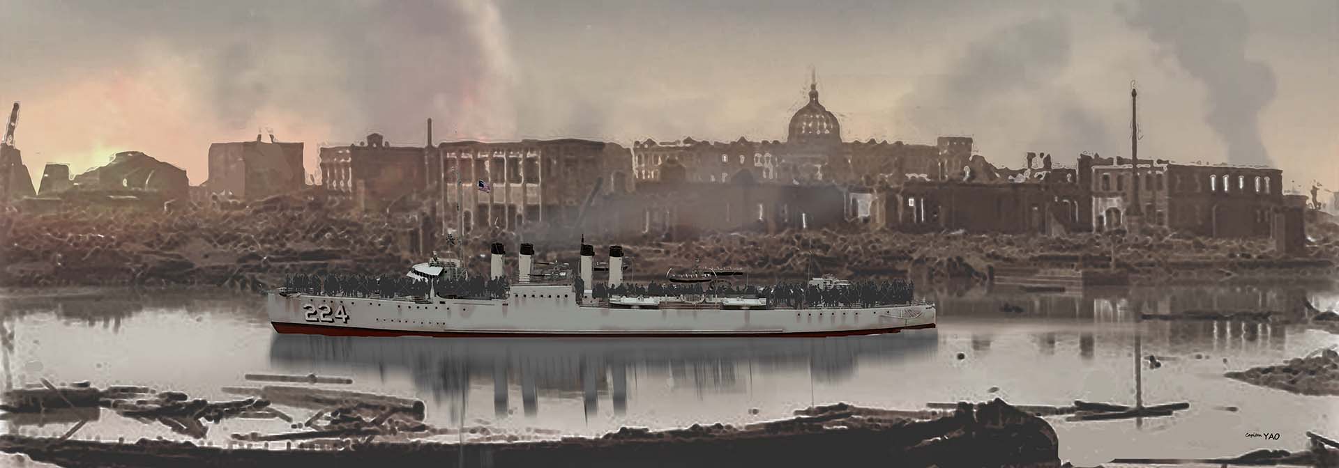 第二天早晨8點30分,所有帝國飯店的西方旅客經由飯店安排步行3英里到河邊搭乘駁船,再在港區換搭三艘美國驅逐艦到橫濱,我們搭乘的是編號224的「斯圖亞特」號(USS Stewart),一艘有四根煙囪的小型軍艦。