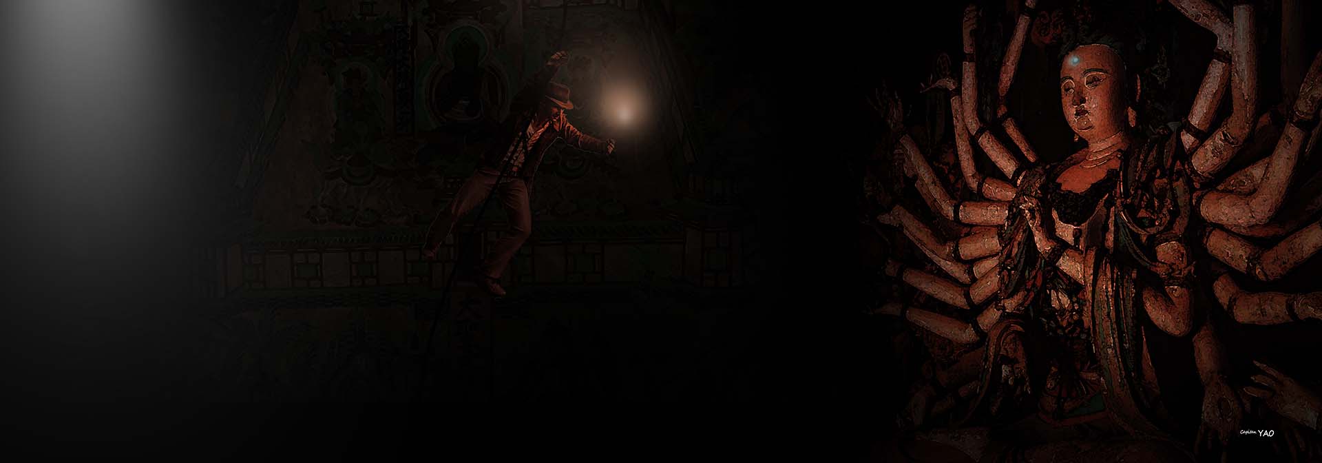 (圖1-4-3) 德芮肯男爵在洞窟以繩索擺盪,用火炬照亮洞中的千手觀音像。