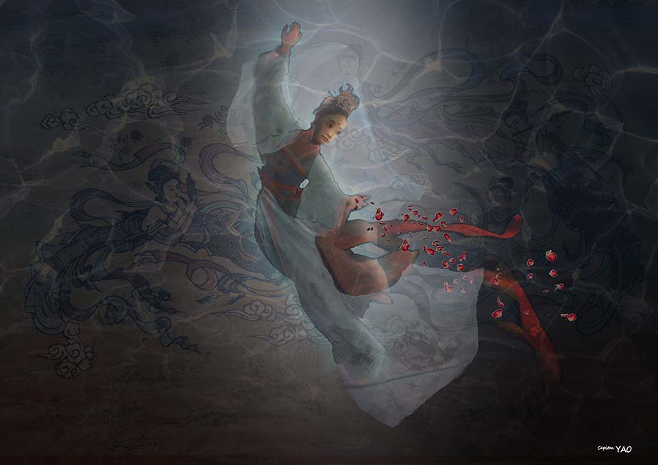 公主要德芮肯坐下,自己走到石窟大廳的中央,就站在洞頂一束陽光投下的發亮區域。她把笛子含在嘴裡吹出幾個音階的長音,笛聲似乎引來一陣風吹過兩旁石室長廊內長短不一的岩柱產生如同歐洲大教堂管風琴般的天籟之音,公主聽到音樂後開始慢慢轉身;這時千手觀音像額頭上的夜明珠開始發出湛藍色的光,在幽暗的洞壁上造成水波光影的動態效果;突然德芮肯瞪大了眼睛,公主竟然凌空飛起了!