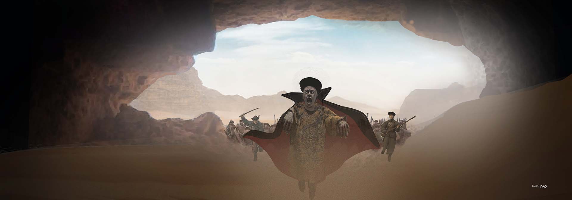 「這是我們樓蘭國的守護神,任何人不許褻瀆!」 「妳是什麼人?敢阻擋我們大國師?」為首的官差大喝道。 「我是樓蘭國公主!快叫你的手下離開!」公主毫不畏懼地說。 「我知道妳是誰!所以我們才會跟蹤到這兒。」披黑斗蓬的男人從簇擁的官差中走向公主,掀起頭罩露出他面如死灰表情陰森躲的臉。 在洞窟門縫後窺視的德芮肯一看大吃一驚:「大國師!」 他想起慈禧太后七十大壽放電影那晚,透過放映機強光反射下那張如鬼魂般的臉。 大國師講話的腔調尖細而緩慢,聲音卻好像是從地獄深處傳來,並且口中發出一股像死屍般的惡臭:「普天下的東西莫不都是皇帝的財產,包含這顆夜明珠,我宣佈它現在屬於老佛爺。 其他人讓開!」 他把斗蓬一揮室內立時飛沙走石讓人睜不開眼睛,這時洞窟頂的陽光似乎也被風沙遮掩同時變暗,千手觀音像上的夜明珠在黑暗中益顯耀眼。