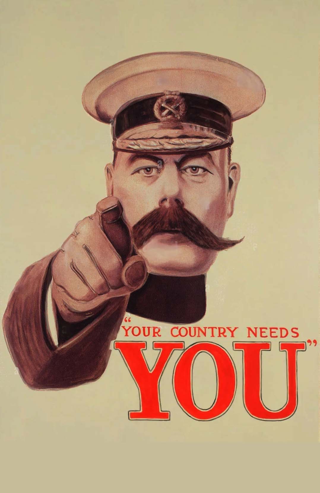 基切納勳爵是軍事情報界的老前輩,曾在十九世紀非洲各殖民地戰爭時代從事情報工作,也曾當過埃及總督。他在歐戰爆發時擔任內閣戰爭大臣,負責在最短期間內把原來只有幾十萬人的英國陸軍急速擴充至三百萬人,那張著名的”Your Country Needs You!”徵兵海報中,一位蓄八字鬍的軍官伸出手指向前的就是基切納勳爵。這張海報後來在1917年美國參戰時亦被借用為美國的徵兵海報,只不過把基切納勳爵換成山姆大叔(Uncle Sam),口號換成”I Want You!”罷了。
