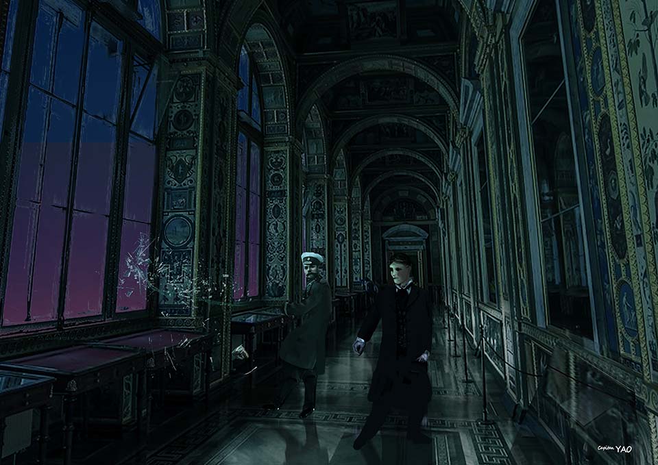 (圖1-9-7) 德芮肯爵士與沙皇在窗邊密談脫逃的計畫,一枚暴民投擲的石塊砸破窗戶玻璃。