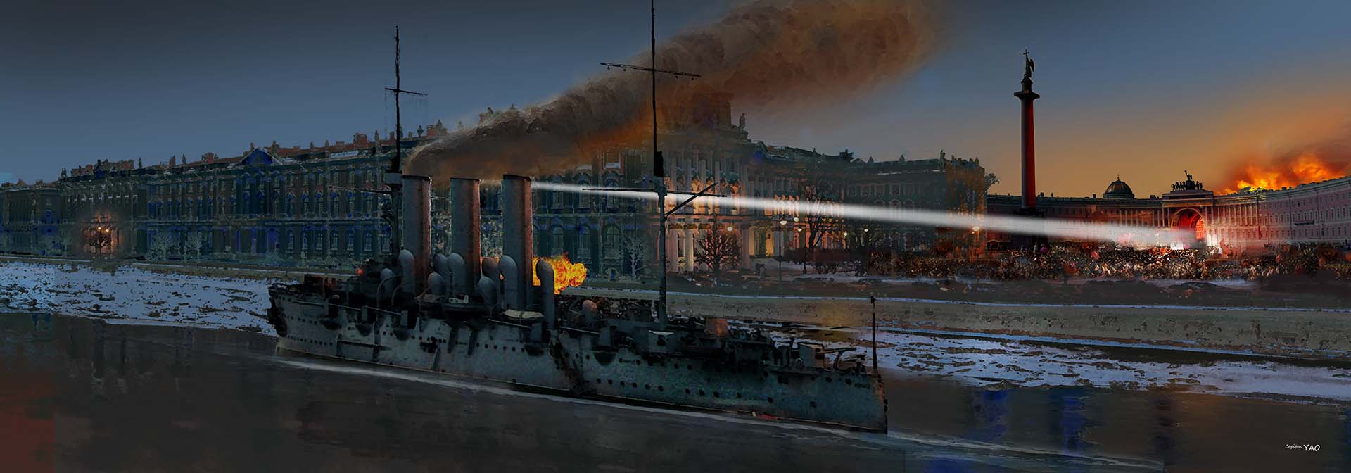 沙皇指的是在河面上靠泊那艘三支煙囪的巡洋艦「拉芙樂爾」號(Aurora),她曾參加日俄戰爭,是那場戰役中少數倖存的軍艦,現擔任聖彼德堡衛戍任務。她的八門6英吋主砲雖然在海戰中算不得什麼,但在這麼近的距離轟擊皇宮那可是綽綽有餘的。