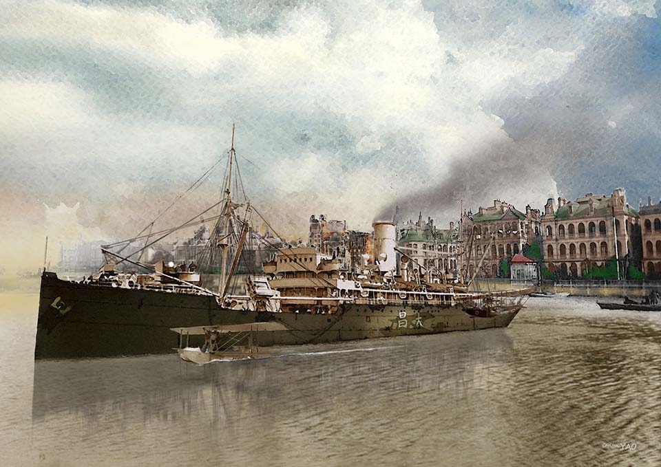 We arrived in Tsingdao on March 22nd. It's a beautiful coastal city that was a German colony before the war. The city has many European-style buildings with white walls and red tiles. I visited Tsingtao as a child on a British warship; my father took me there to visit the German East Asia Squadron. Now it's also the most important naval port in northern China, where British, Japanese, and American warships frequently dock. We boarded a ship of about two thousand tons at the Tsngtao Port naval dock. The air was filled with the smell of fresh paint. The ship had a black hull, a white superstructure, and brown masts and booms, making it look like a merchant ship. There were two piles of things covered with canvas on the stern deck, but we didn't know what they were. Lieutenant Colonel Korniloff told me, "This is the Chenhai of our Northeast Fleet, the only seaplane carrier in all of China."