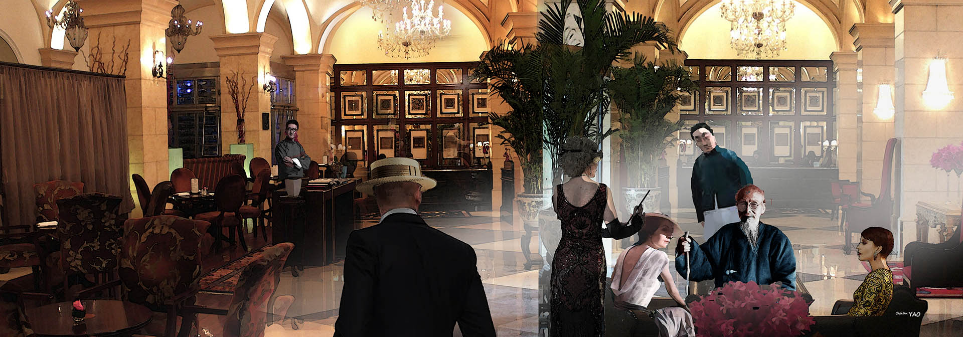 As I escorted Mr. Hedin upstairs, I saw a group of Westerners surrounding an elderly Chinese man on the other side of the lobby. He had long white eyebrows and a beard, wore a gray-blue robe, was thin, and had an air of otherworldly wisdom; he looked to be at least eighty or ninety years old. I asked the waiter what they were doing. The waiter said that it was Chiu Taochi, the most famous fortune teller in Peking, who frequently traveled around major hotels in Peking to tell fortunes for foreigners. Today it was the turn of International Hotel to come. Intrigued, I went over to see what was going on.