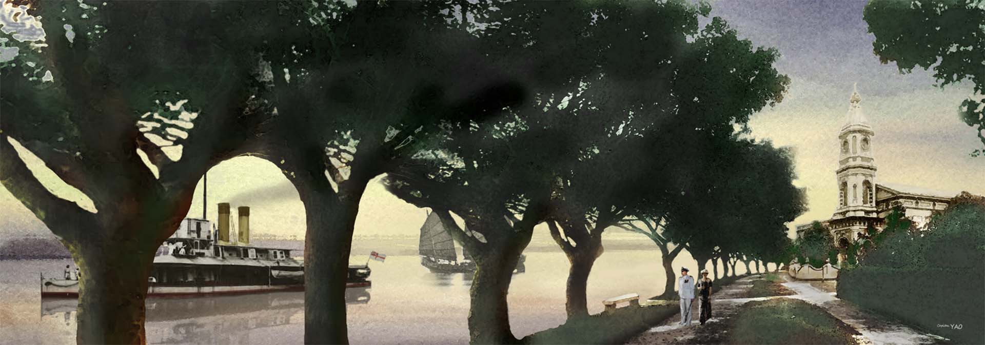 (圖2-5-8) 沙面英、法租界臨珠江的林蔭道,後方的教堂是「沙面堂」,珠江上停泊的是英國海軍河用炮艦”HMS Moorhen”(摩漢號)。