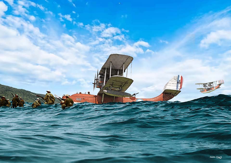 「這就是我來找你的原因,水匪在本港到處都有眼線,大型軍艦出動很難做到保密,行進速度又慢,等開到當地水匪早就躲起來了還清勦個屁?」M 先生說:「但如果我們航空母艦提早幾天出港在外海待命,登陸部隊則用大型水上飛機裝載同行,然後由你們做空中偵查,我知道你對香港海域很熟一定很快就能找到,發現了匪蹤立刻通知航艦飛機起飛並帶隊到現場轟炸與登陸。如此保密加上機動,一定能把羅漢打個措手不及。」
