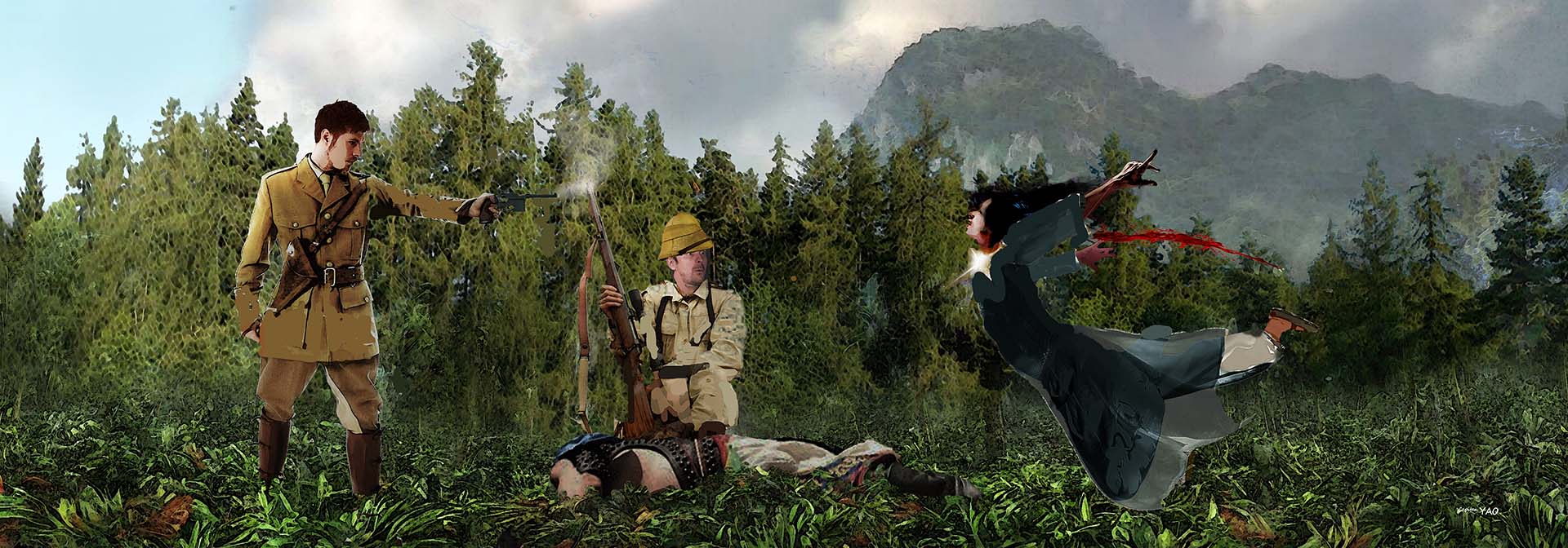 M 先生手拿著相片站在方才被他擊斃的第一具屍體旁邊比對後說:「沒錯!這就是羅漢!總算讓他過不了 1927 年!」
