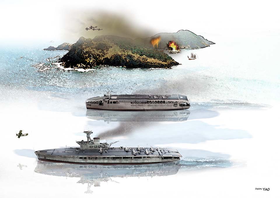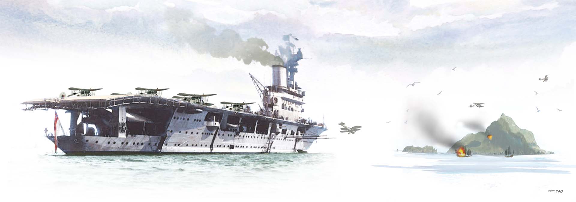 (圖2-6-9) 英國皇家海軍航空母艦「競技神號」起飛飛機轟炸海盜聚集的離島。