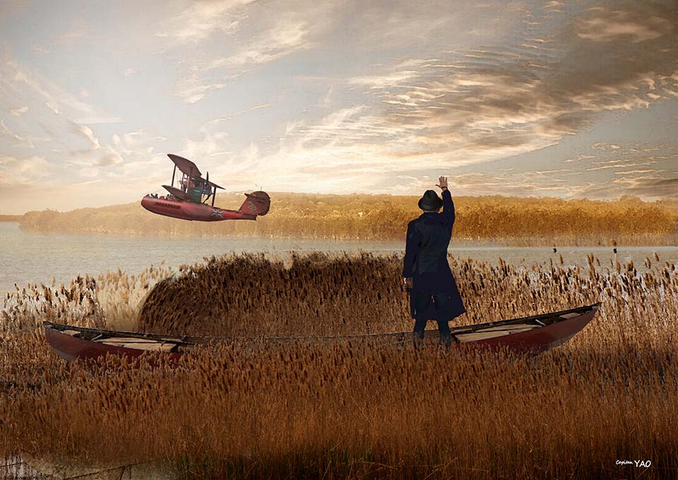 飛機在江面滑行,很快地就離開水面迎向朝陽往東飛去,我把那架紙飛機往天空一拋,上升氣流把它帶向高空。