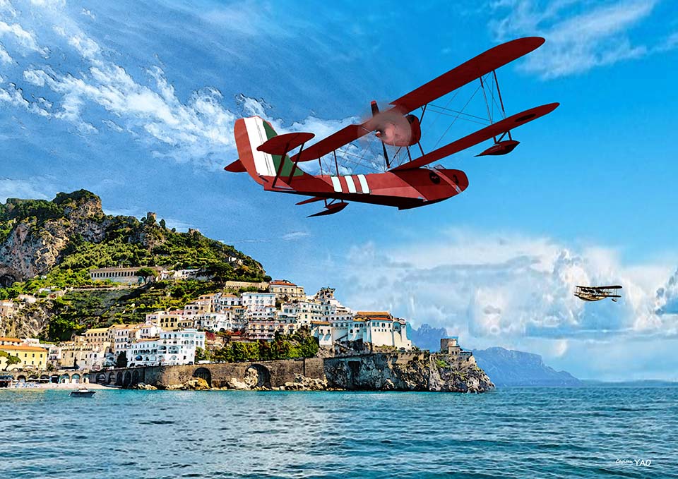 The next afternoon, as we passed Naples in southern Italy, I spotted a bright red Macchi M-7bis seaplane approaching us. It was my friend, General Francesco de Pinedo of the Italian Air Force, who had completed a round-the-world flight in 1925. At that time, few people had such a record, so he naturally became the person we sought his advice from. Through prior telegram communication, he warmly invited us to dinner in the port of Naples.