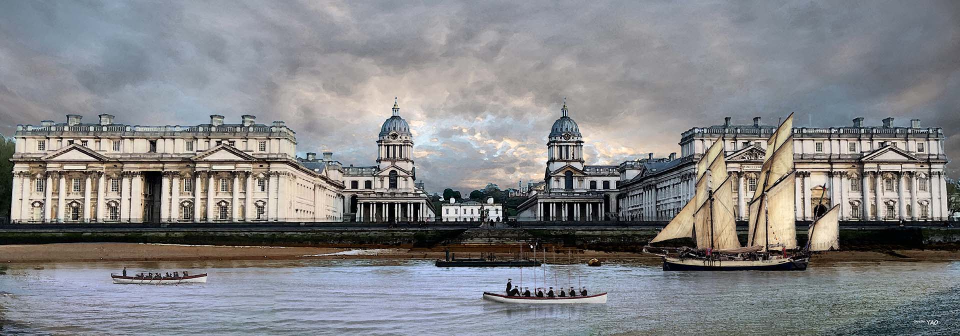 (圖 3-4-5) 格林威治皇家海軍學院,後方山丘是格林威治天文臺,也是本初子午線通過的地方。