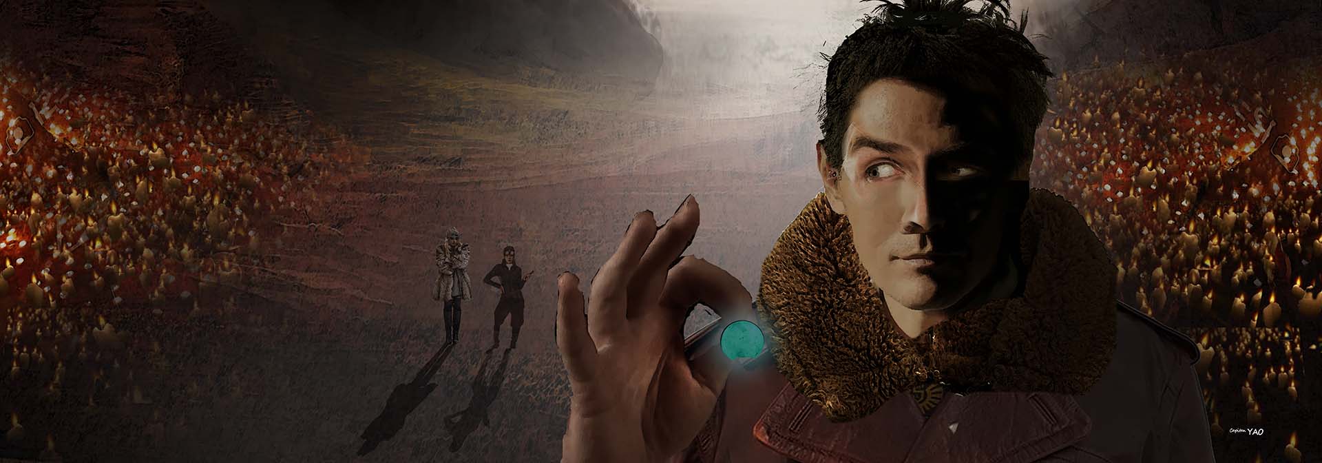 (圖 3-7-14) 水波光影中,金璧輝飄浮在空中與飛天仙女共舞,突然放聲狂笑。 然而此時仙女們愈轉愈快變成一陣旋風,在洞窟中引起飛沙走石並將金璧輝重重摔出圈外。當大家都覺莫名其妙時,我趕緊在狂風中翻著父親的樓蘭日記,我注意到其中一段高聲讀給大家聽。 「……女祭司不僅要是公主,還必須是處女…」 「處女? 八格呀魯!」金璧輝邊咒罵邊從地上爬起來喊道:「馬上尉!」 我回頭一看,在洞窟四周高處,竟然是我的哥哥馬上尉帶著一群蒙古騎兵持槍包圍了我們。 「把夜明珠給我摘下來!」金璧輝下令。 「是!」馬上尉奉命奔往佛像。 「哥哥?」當馬上尉從我面前經過時我情不自禁脫口而出,他一聽轉頭看到我亦怔住,雙方僵在原地不動。 「馬上尉聽我的命令!」金璧輝喊道, 可是他一動也不動。 這時我感覺到哥哥體內納蘭的靈魂開始浮現,從外觀到表情到聲音都在逐步改變,我也感覺到哥哥是想要制止納蘭掌控他的身體,可是抵抗的力量正逐漸衰弱中。這時主祭司仙女飄到他的面前凝視著。 「娘?真的是妳?」哥哥伸出顫抖的手指向仙女,但馬上又變成納蘭的聲音:「還我大清夜明珠!」 「娘, 那真的是弟弟嗎?」這時哥哥的聲音已經氣若游絲,立刻又被納蘭的聲音蓋了過去:「英國狗的雜種,下地獄吧!」 「下地獄?」哥哥奮力拔出手槍抵住自己的太陽穴說:「我們一起下吧!」 「噢! 不要!」我的喊聲還沒結束,一聲槍響哥哥倒在血泊中,納蘭也跟著魂飛魄散。