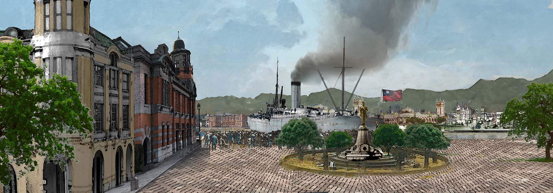 (圖 3-9-12) 中華民國東北海軍的訓練艦「鎮海號」自淡水轉往基隆,停靠在稅關碼頭前。