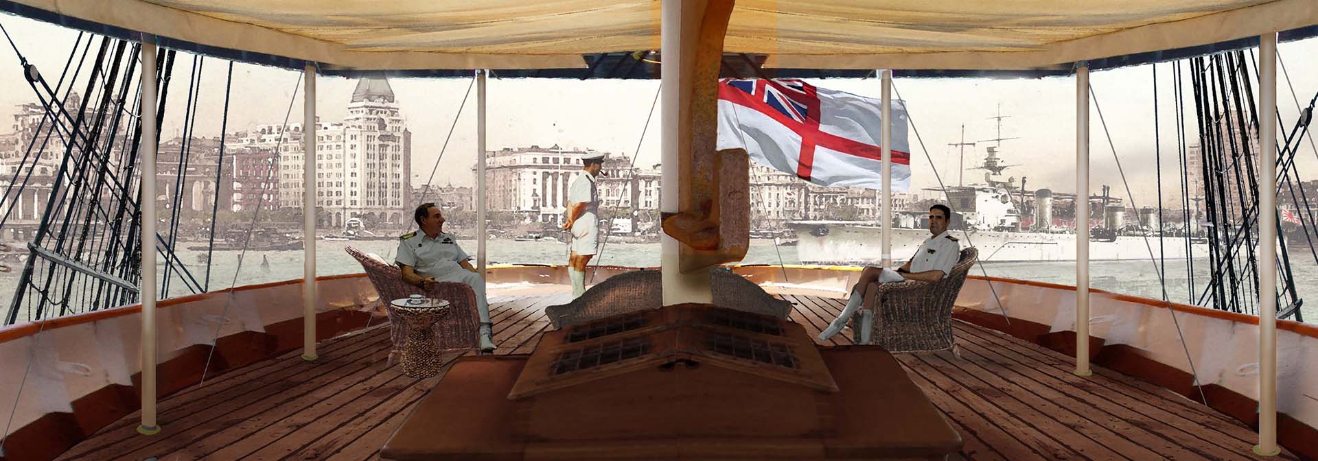 (圖 4-3-2) 龍保羅應揚子江艦隊司令之邀,在炮艦的後甲板喝茶。