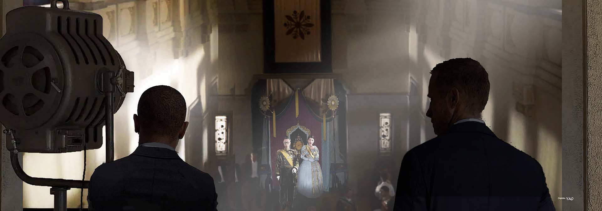 有天晚上在宮中舉行慶祝加冕的舞會,二樓的迴廊裝置了許多高亮度的弧光燈把舞會照的像在拍電影的場景,我好奇地登上迴廊,迎面看到甘粕正彥正在指導攝影機拍攝。這一次再不能裝作不認識了,只好主動搭訕:「喲!甘粕先生當導演了?」
