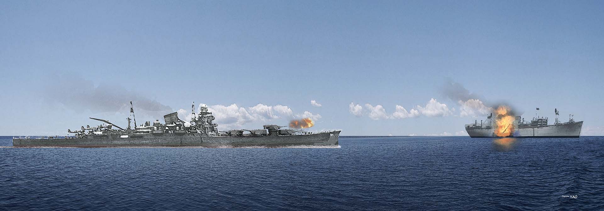(圖 5-9-10) 日本重巡洋艦「利根」在印度洋攻擊英國商船"Behar",之後殺害俘虜的69名船員。 |