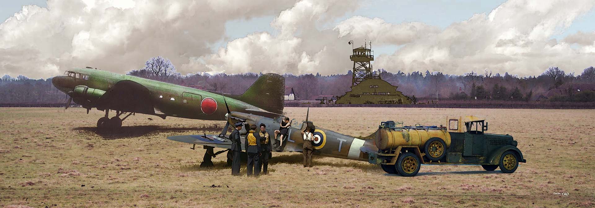 (圖 5-9-3) 龍保羅駕駛噴火式戰鬥機抵達日軍的機場,一架日本仿製 DC-3 的運輸機( Tabby )正在等待。 日本軍官很友善的哈腰敬禮握手,還奉上餐食,我看了看那架 Tabby,又回頭看看噴火式,問他是否能幫噴火式加油,我打算繼續駕駛它到上海。日本軍官聞言連忙搖頭說∶「不成不成,讓它飛在我軍控制的天空,難保不會因誤會而遭擊落。」 他講的正好相反,其實以當時的制空權,我若搭乘 Tabby 被美軍戰機擊落的機率恐怕還比駕駛自己的噴火式被日軍擊落的機會大。由於我的堅持日本軍官只好妥協,加滿油後我跟隨 Tabby起飛,一路緊跟飛往上海龍華機場。