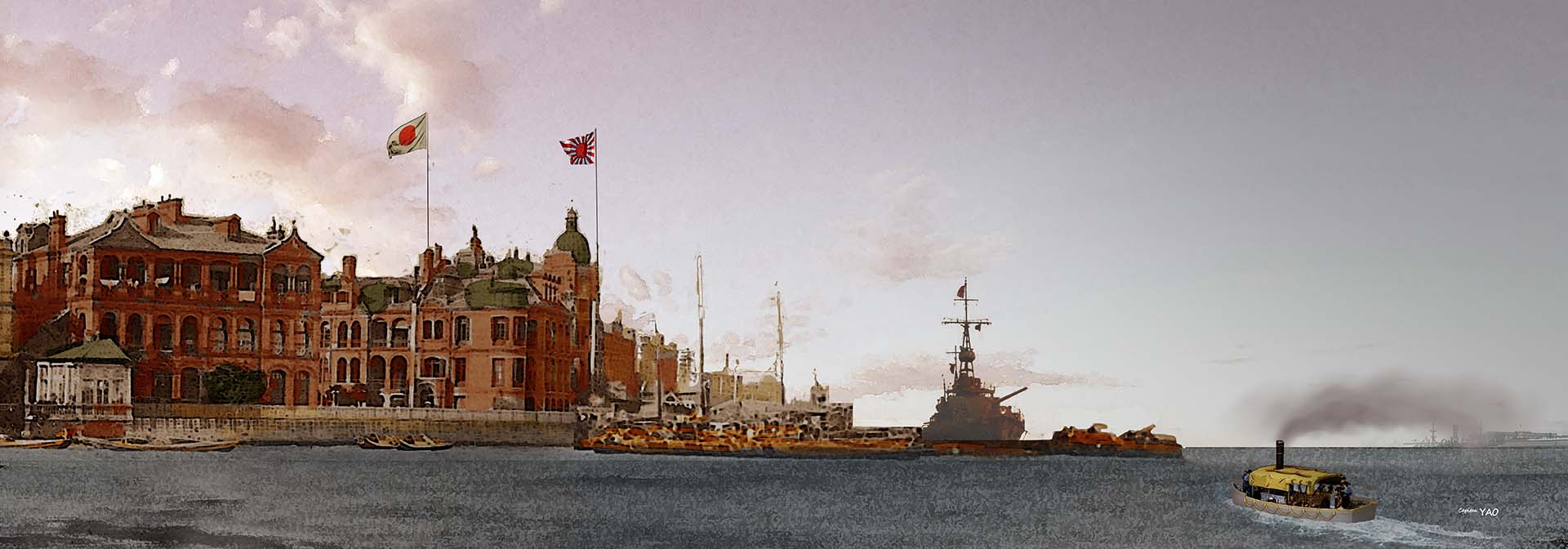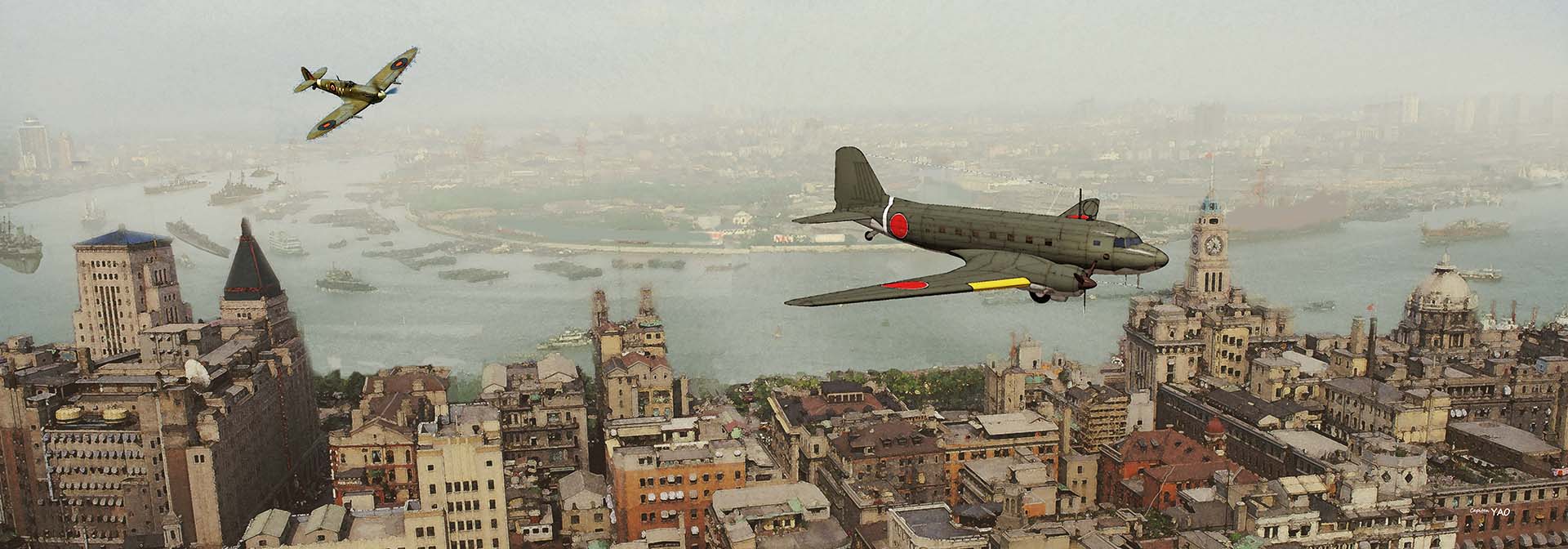 (圖 5-9-4) 龍保羅駕駛噴火式戰鬥機跟隨日本 Tabby 運輸機飛越上海外灘上空。 沿路的天空很寧靜,既沒日軍飛機也沒有盟軍飛機,到了黃浦江邊的龍華機場日機示意我先降落,於是我在繞場後讓噴火式以優雅的姿態輕輕飄降在跑道上,我一下機日本人就用帆布把飛機遮蔽,推到機棚內隱藏起來。 我被用一艘蒸汽艇從龍華機場接走,沿途經過熟悉的外灘,黃浦江上空蕩蕩的一艘大型軍艦都沒有。蒸汽艇來到蘇州河口海軍碼頭旁停泊的一艘軍艦,我認出那是日本駐華炮艦隊的旗艦「宇治」,這裡就是當年「出雲艦」停泊的位置,也是1942年我與山本五十六在「多多良艦」會面的地方。