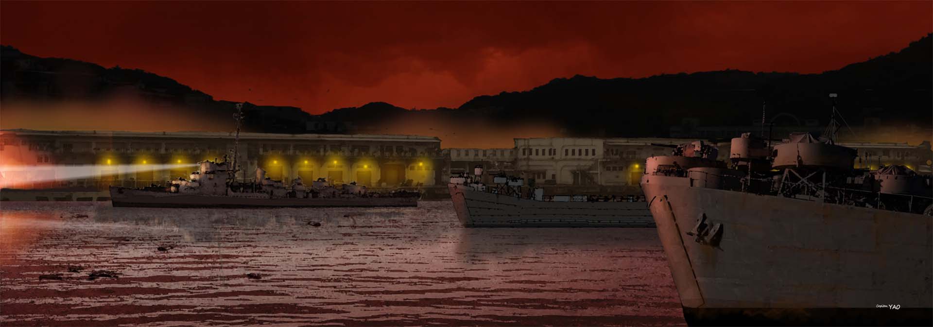 (圖 6-2-1) 「太康」、「中海」與「中權」三艘軍艦1947年三月七日夜晚在基隆港。