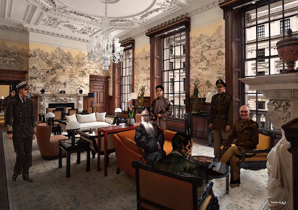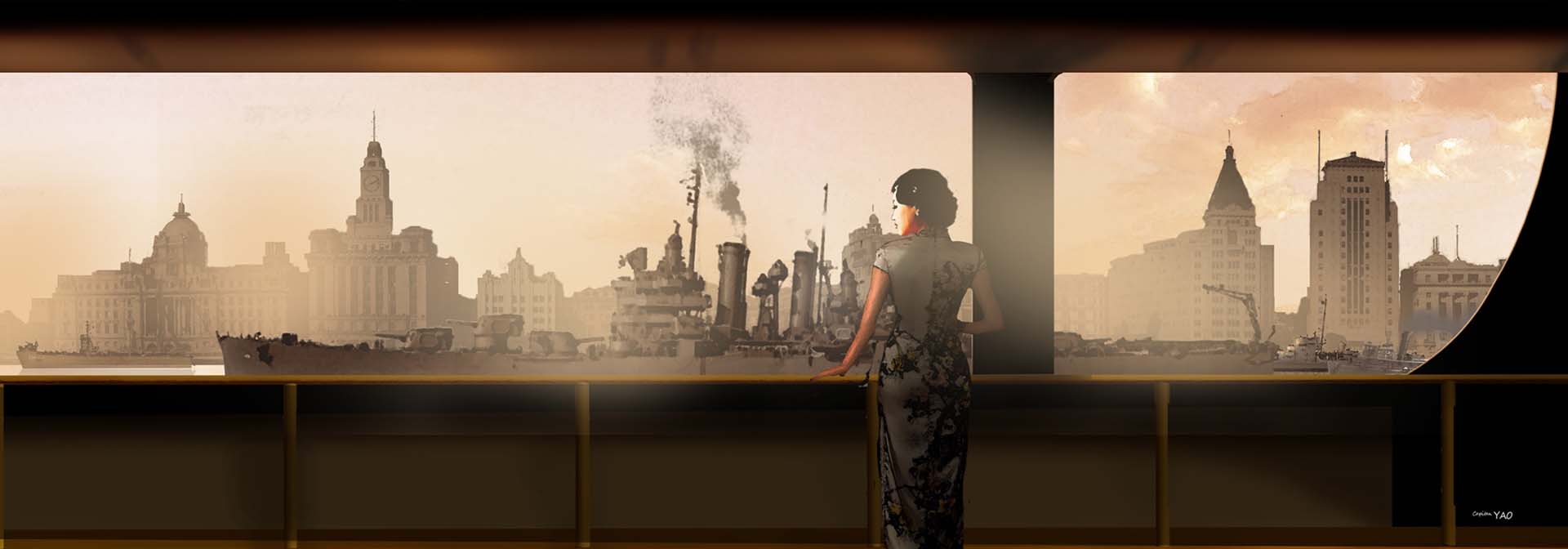 (Figure 6-4-6) 李香蘭搭乘遣返日本的「雲仙丸」在夕陽中駛離上海,黃浦江上滿是美國軍艦,此時船上的擴音器正好在播放她的「夜來香」。 川島芳子的事情告一段落後立刻準備回英國,因為五月中我要代表皇家海軍監督英國援贈的「重慶號」巡洋艦駛回中國。我決定從東京搭乘美軍的運輸機飛越太平洋,這樣就能省下不少旅費,然後搭乘火車穿越美國到華府拜訪國務卿馬歇爾,之後搭船返回英國老家。我已打電報給鮑克塞,說會去他家拜訪他與項美麗。因為行程比較趕,我最好在三月底前啟程。