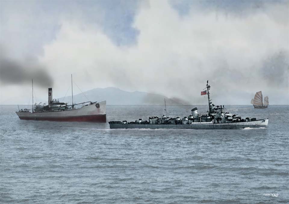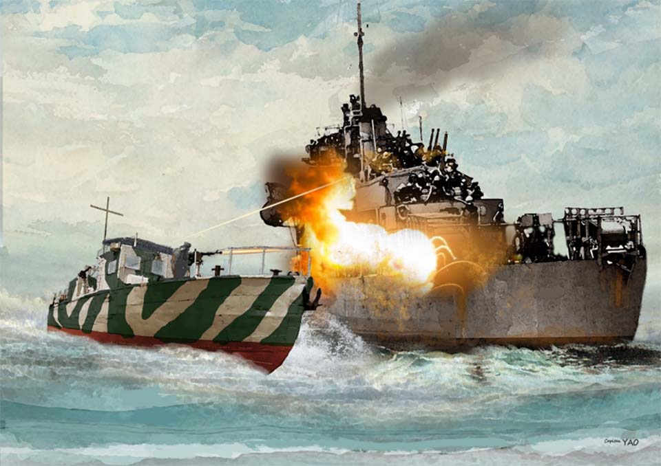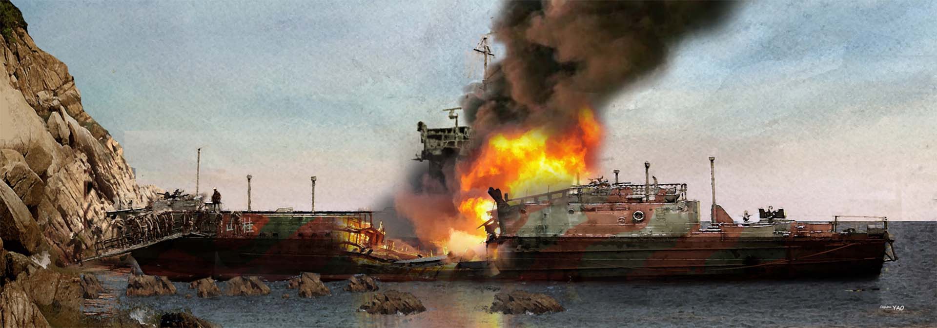 (圖 7-1-9) 共軍的「解放號」砲艇攻擊國民黨艦隊旗艦「太和號」。