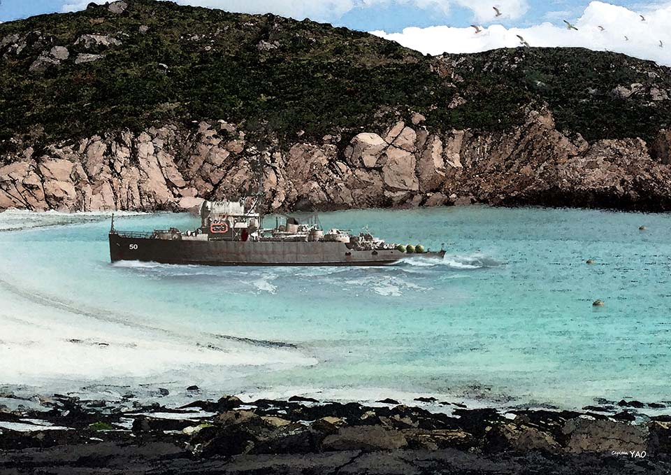 (圖 7-1-12) 擔任佈雷任務的「永豐艦」被自己佈下的水雷困在共軍控制的海岸邊。