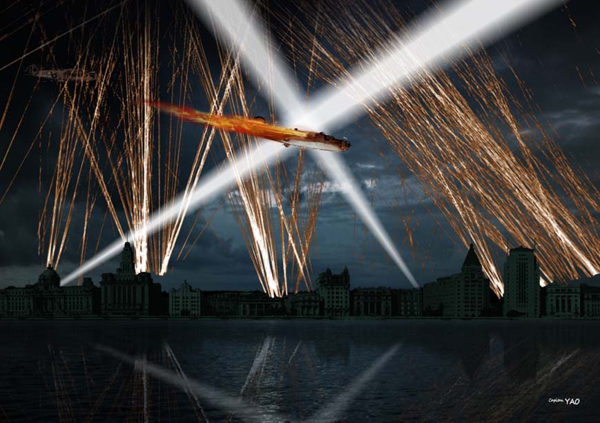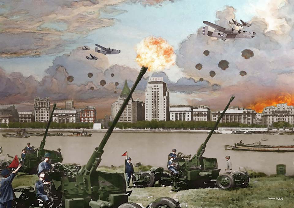 (圖 7-1-2) 1950年二月六日國民黨空軍轟炸上海。 不久國民黨空軍發現在上海的天空有噴射戰鬥機出沒的跡象,經情報研判是蘇聯空軍的米格十五進駐以防止國民黨空軍再來轟炸。為了消除隱患,空軍第八大隊兩架B-24重轟炸機在大隊長李肇華中校率領下五月十一日由新竹起飛來到上海,準備轟炸江灣機場的蘇聯米格-15戰鬥機,誰知大陸方面早已得知情報,上海實施燈火管制並用探照燈鎖定,當場用高射砲將大隊長的座機擊落,全部機組員喪命,僚機只好放棄任務逃回。