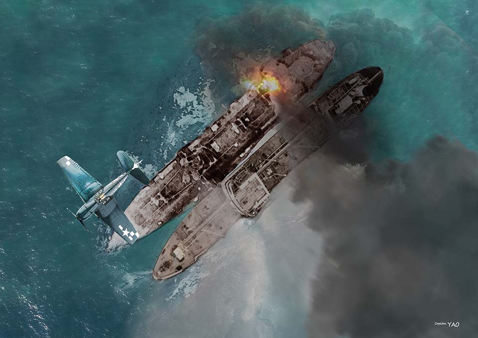 (圖 7-1-5) 在高雄港內被美國海軍艦載機轟炸沉沒的油輪「黑潮丸」,一旁並泊的是載運盟軍俘虜的「江ノ浦丸」。